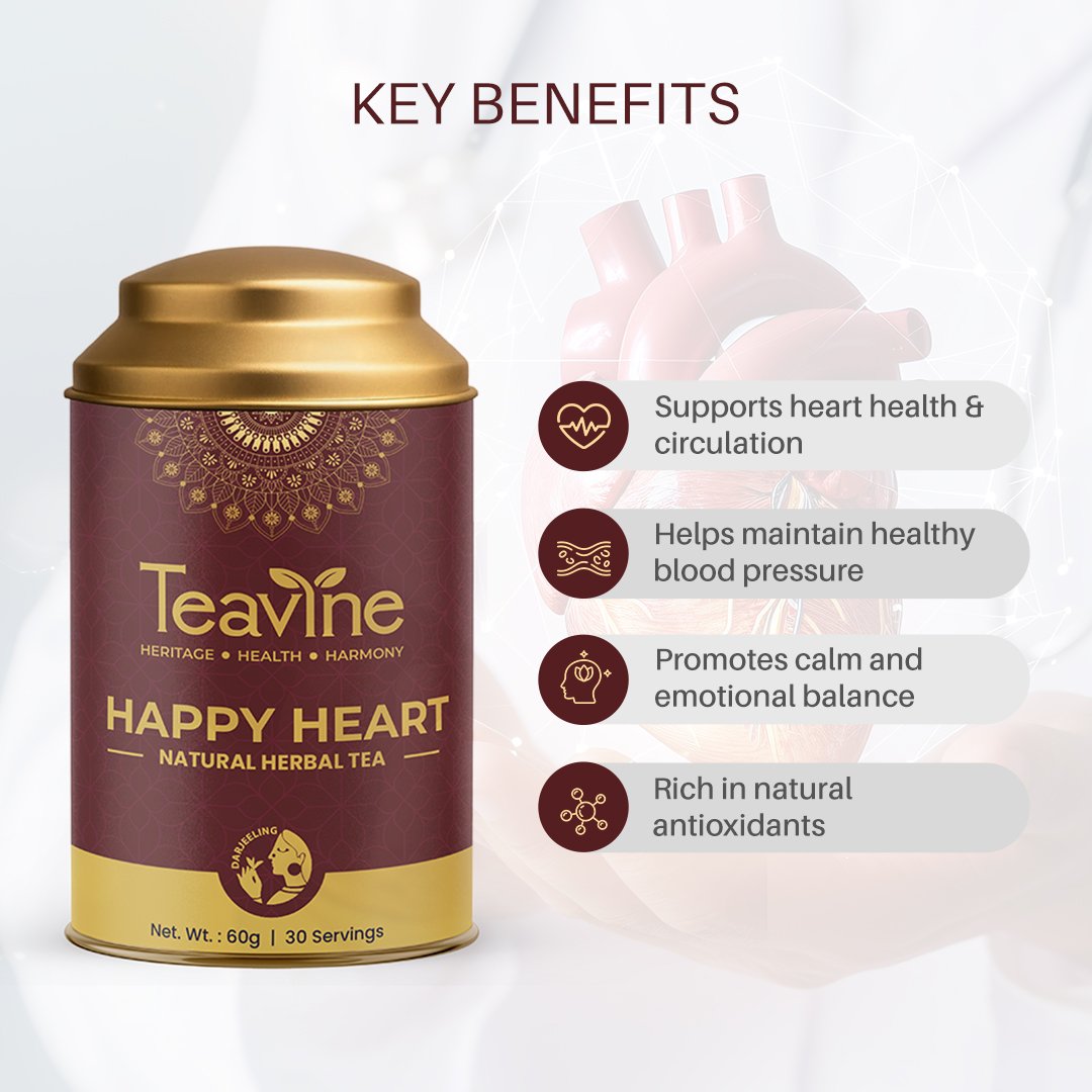 Nurture your heart and mind with Happy Heart Herbal Tea, a grounding infusion that blends premium Darjeeling green tea with traditional Ayurvedic herbs known for their calming and circulatory support. This thoughtfully crafted, caffeine-light blend is designed to gently encourage heart wellness, support healthy blood flow, and help maintain a sense of emotional balance—all in one soothing, aromatic cup.