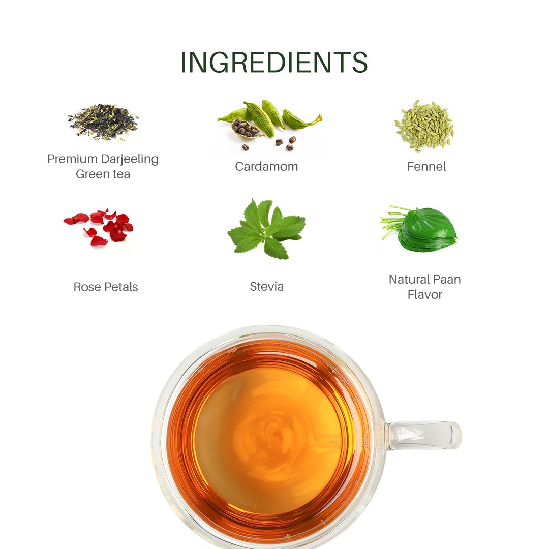 With its floral, herbaceous aroma and smooth green tea base, this blend offers a unique tea experience that feels both rooted in tradition and refreshingly modern. While not intended to diagnose or treat any condition, Rose Paan Green Tea is a flavorful way to support your wellness ritual—especially after meals.